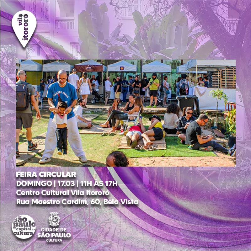 O Circular é um projeto de apoio à Cultura, incentivando os pequenos produtores locais e marcas autorais. Circulamos pela Cidade ocupando espaços públicos levando cultura, arte, moda e oficinas. Nesta edição, ocuparemos a Vila Itororó com 20 artistas criativos de diversos segmentos: moda, autocuidado, acessórios, além de muitas comidinhas e bebidas.