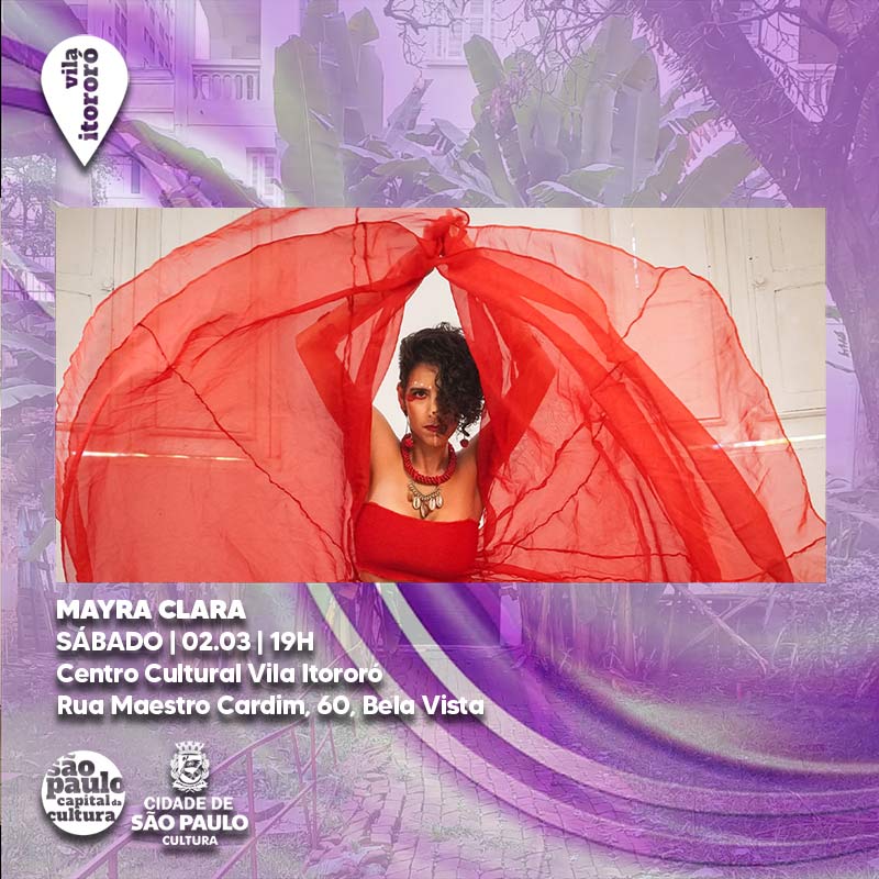 Mayra Clara, cantora, produtora e atriz, da cidade do Recife (na verdade, Acre-pernambucana, nascida em Rio Branco-AC e criada em Recife-PE). Mulher forte do nordeste. Integrante da Reverbo – Mostra Autoral de Música Pernambucana – já se apresentou na Ocupação Reverbo que ocorreu no Itaú Cultural SP, em julho de 2022.