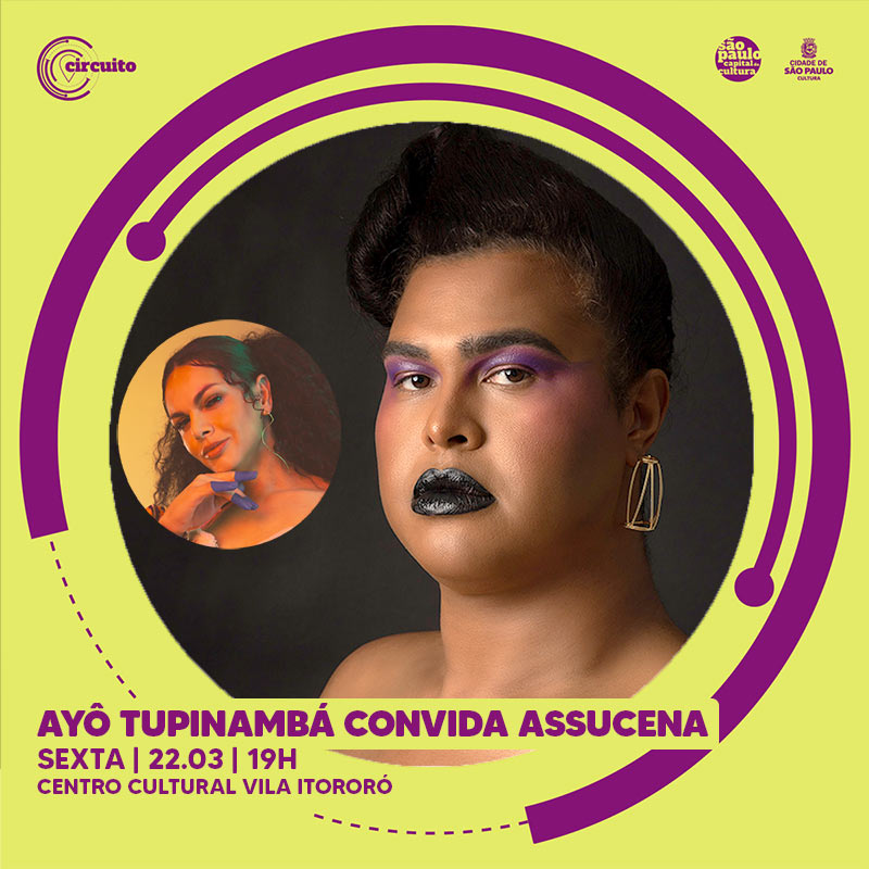 Ayô Tupinambá, uma artista multifacetada,originária da periferia de São Paulo, emerge como uma figura proeminente no cenário musical brasileiro, transmitindo suas experiências e emoções por meio de sua voz única. Além do palco, ela contribui para a conscientização e educação. Ministra palestras, cursos e rodas de conversas em eventos corporativos, compartilhando sua experiência única e se tornando uma voz inspiradora para a comunidade LGBTQIA+. Sua presença não apenas enriquece o panorama artístico, mas também serve como uma referência e representatividade valiosa para todos que buscam autenticidade e diversidade na sociedade contemporânea. Para essa edição Ayô convida a artista Assucena, premiada cantora já indicada ao Grammy Latino e que encanta a todes com sua voz e presença surpreendentes.
