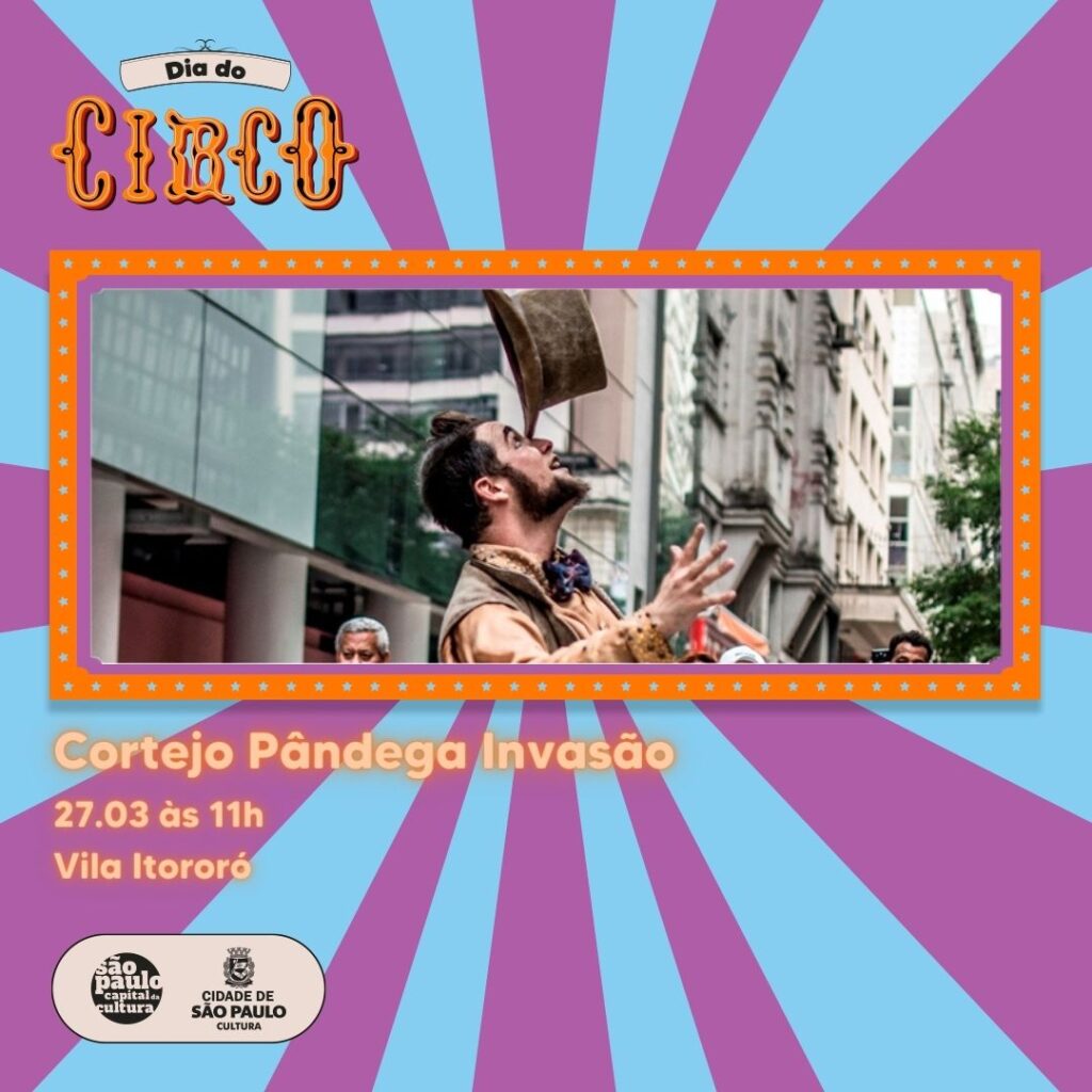 E tem palhaçada? Tem sim, senhor!!! E tem malabaristas, acróbatas, equilibristas, mágicos, perna de pau e contorcionistas. Neste cortejo, quinze artistas circenses dão as boas-vindas para a alegria e comemoram o Dia do Circo.