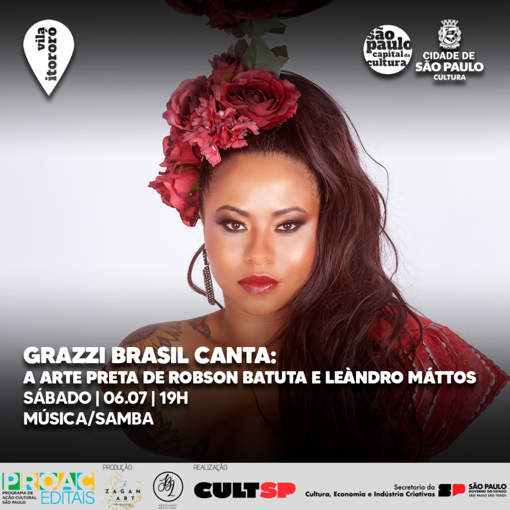 Grazzi Brasil canta a arte preta de Robson Batuta e Leàndro Máttos. O álbum inédito, apoiado pelo ProAC de São Paulo, contém lindas músicas em homenagem aos dois compositores, que são um marco no samba paulista. Robson Batuta é músico, instrumentista, compositor e cantor. Seu conhecimento musical foi construído na Escola de Samba do Palmares, fundada pelo seu pai, Luiz Gonzaga Alves, o Marinheiro. Leàndro Máttos, sambista, cantor, músico, compositor, arranjador e produtor musical, tem um histórico brilhante na música, desde seu início como discípulo de José Menezes, o Maestro, até os projetos atuais. Grazzi traz neste terceiro álbum uma interpretação impecável e o lançamento oficial será um encontro inesquecível com toda certeza.