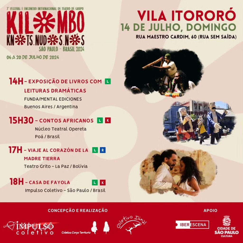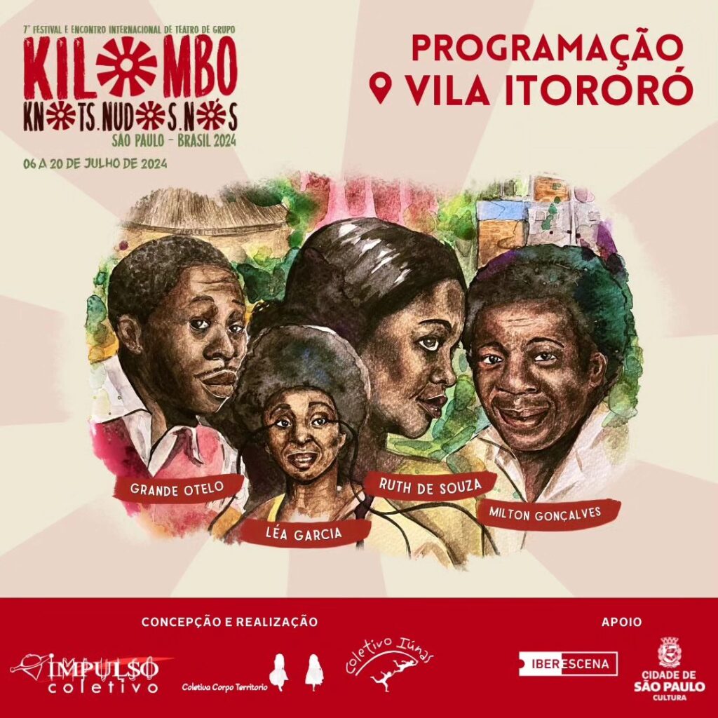 A 7ª edição do Festival e Encontro Internacional de Teatro do grupo KNOTS.NUDOS.NÓS – edição KILOMBO – 2024 chega pela primeira vez a São Paulo! O evento bienal e itinerante, que já percorreu várias cidades do mundo desde 2011, acontece pela primeira vez em São Paulo, com uma extensa programação de 6 a 20 de julho, em diversos locais como Galeria Olido, Tendal da Lapa, Centro de Referência de Dança, Vila Itororó e Teatro Flávio Império. Nesta edição, participam 24 coletivos artísticos com mais de 80 artistas de países como Argentina, Brasil, Bolívia, Chile, Colômbia, Equador, México, Noruega e Venezuela. Todas as apresentações e oficinas são gratuitas. A 7ª edição do festival conta com o apoio da Secretaria Municipal de Cultura de São Paulo e do Instituto Tebas. Confira a programação completa no Instagram @knots.nudos.nos.