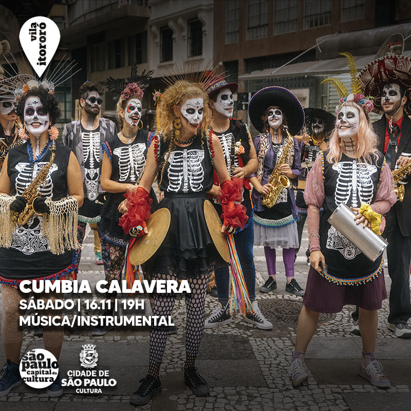 Grupo latinoamericano que propõe uma releitura instrumental de cumbias clássicas e que apresenta também composições próprias, difundindo melodias e elementos rítmicos da cumbia chicha, da cumbia colombiana e da música folclórica andina. Formada por integrantes vindos de diversos países como Argentina, Brasil,Chile, Cuba, Togo e Uruguai, o grupo se apresenta de forma performática, baseada na iconografia da Fiesta de los Muertos do México. Devido a seu repertório cativante e a sua formação de fanfarra, o grupo promove um divertido show atrativo para todas as idades. A Cumbia Calavera celebra a vida e reconhece a morte, derrubando fronteiras e aproximando culturas através da arte.