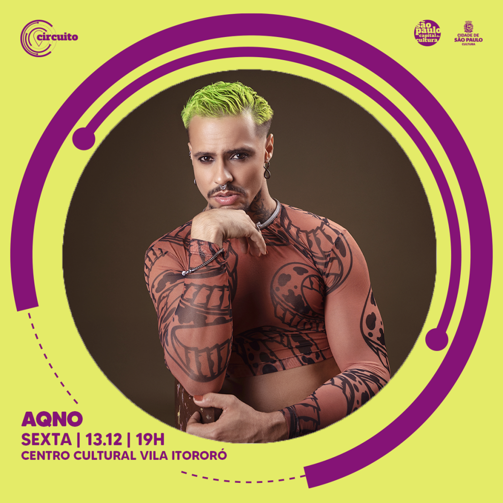 O cantor AQNO, de Marabá (PA) apresenta repertório do álbum “O Retorno de Saturno”, repertório que fez o artista, residente em Belém (PA), passar por diversos palcos e festivais do país. Ele também apresenta novas músicas do novo álbum patrocinado pela Natura Musical, e alguns sucessos do Brega e Tecno-brega do Norte do Brasil, que prometem fazer todo mundo dançar.