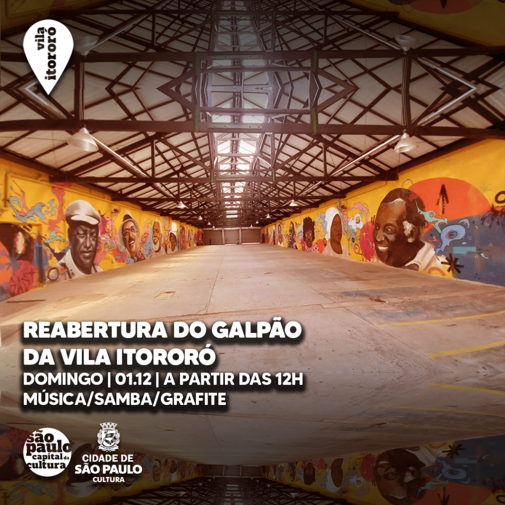 A reabertura do Galpão da Vila acontece no dia 01/12 à partir das 12h, com música, exposição do mural e uma praça de alimentação com venda de feijoada e bebidas.