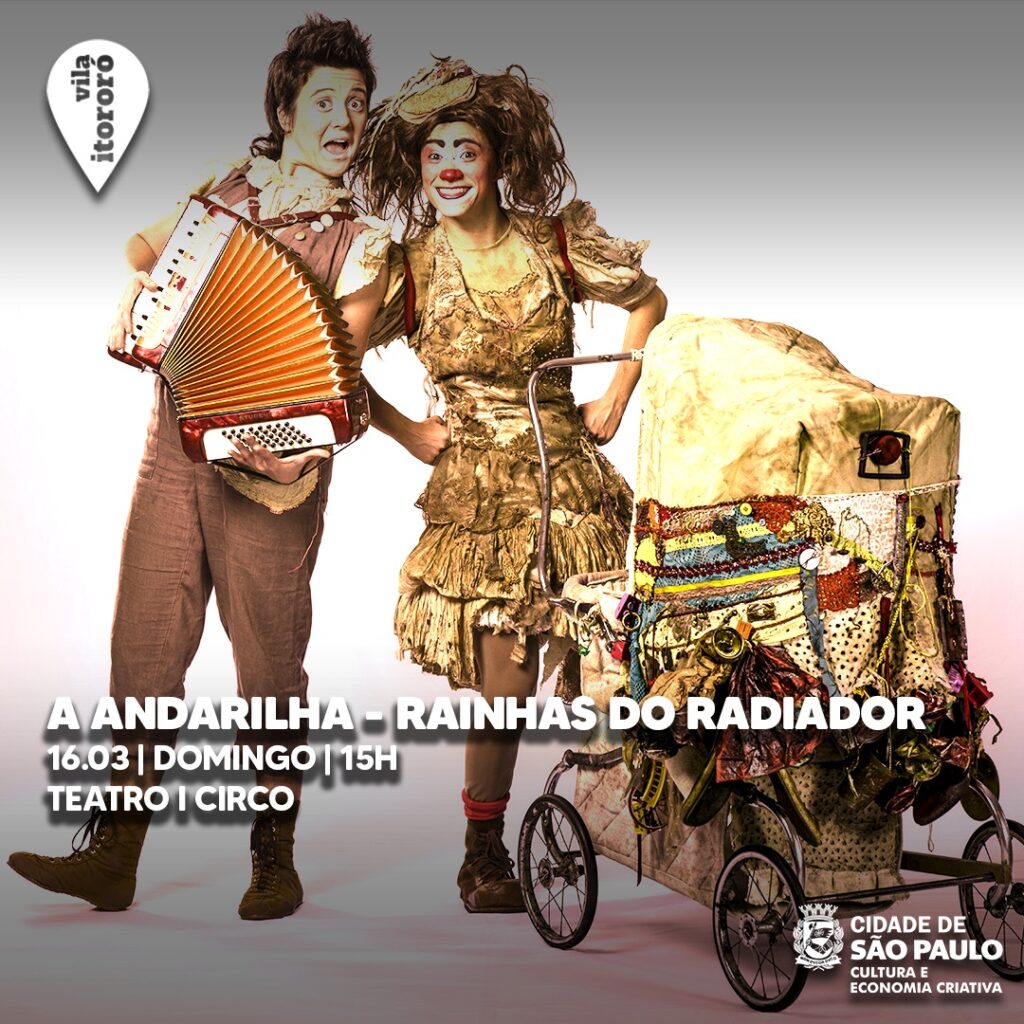 A Andarilha –  Rainhas do Radiador – Na peça, acompanhamos a palhaça Rufina, que transforma o desafio de cuidar de seu bebê em um verdadeiro show de circo, com malabares, acrobacias, dança, música e mágica! Interpretada por Aline Hernandes e com trilha ao vivo, Rufina nos encanta com suas aventuras e o amor materno.