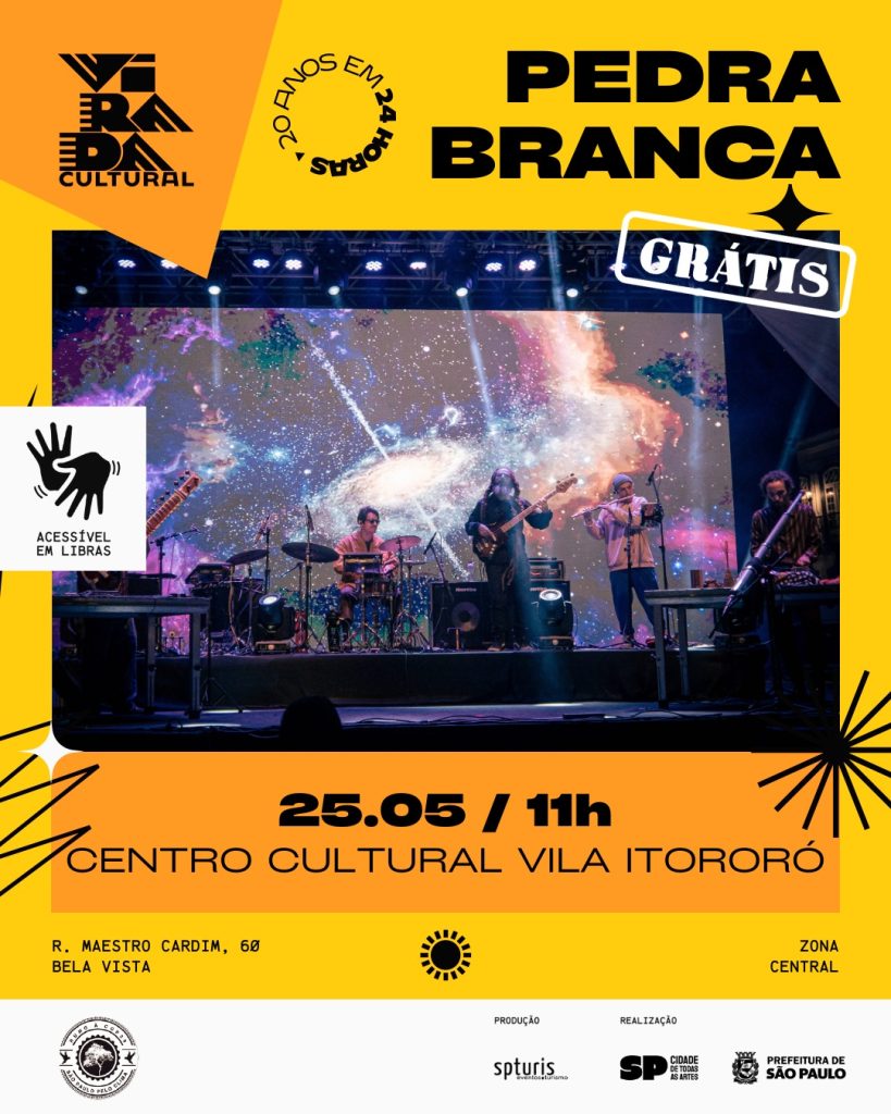 Difundindo a multiculturalidade criativa que o projeto desenvolve em suas sonoridades e pesquisas, integrando a música étnica tradicional mundial com vertentes da música urbana, contemporânea executados com identidade própria e brasileira. Desde 2001 produzido por Luciano Sallun vem trazendo de forma singular uma maneira muito apropriada de fazer música do mundo, em uma visão contemporânea e universal. De forma pioneira, Pedra Branca vem sendo referência no Brasil e internacionalmente. Nessa apresentação tocarão músicas de diversos álbuns como Terrakota (2023), Unus Mundus (2020) e Religare (2018), DNA (2014), Radio Global (2011) e Feijoada Polifônica (2006). Ao vivo trabalham com conceito de fusão de banda com o eletrônico programado e executado como arranjo das composições.