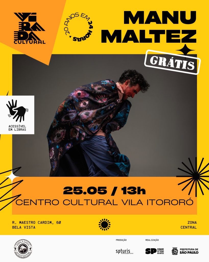Manu Maltez celebra 25 anos de carreira, com o seu quinto álbum intitulado “Madrugada Até o Fim”. A madrugada, espaço de tempo depois da meia noite até a alvorada, aparece nessa obra mais como um estado filosófico, mítico, ou ainda “um outro estado da matéria”. Como diz Manu em uma das canções do disco: Madrugada pousou na minha mão/ e fez o seu maremoto/ balé de lua e de cão. O artista sobe ao palco acompanhado dos músicos Bruno Prado, Thaís Nicodemo e Elisa Gudin.