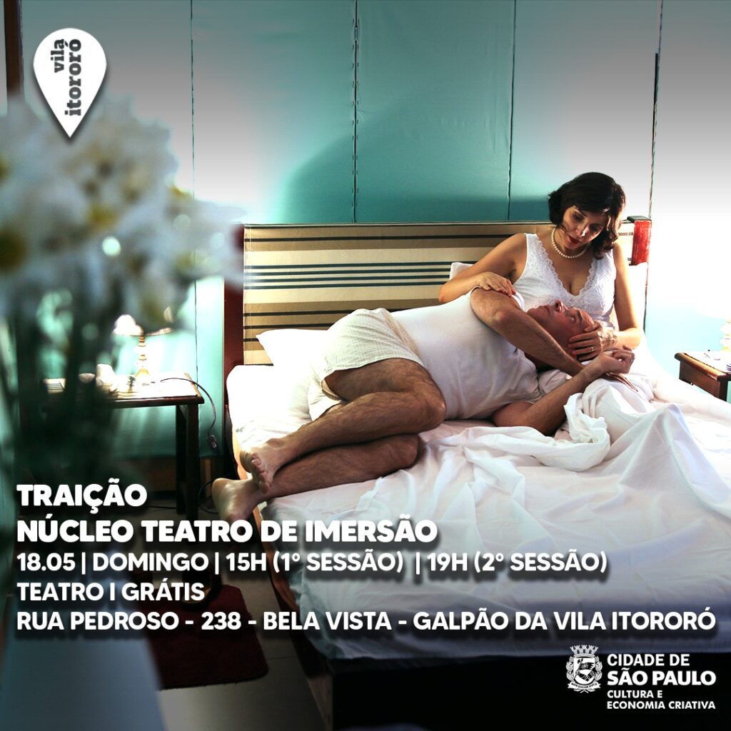 Nos anos 1960, um triângulo amoroso se desenvolve entre Érica, seu marido Roberto e Jeremias, melhor amigo de Roberto, todos moradores do mesmo edifício. Nesta montagem imersiva e itinerante do Núcleo Teatro de Imersão, adaptada da obra prima de Harold Pinter (Nobel da Literatura – 2005), os espectadores circulam entre os apartamentos dos personagens, sem separação entre palco e plateia e cercados pelo cenário, pelos personagens, pelos sons e aromas da cena. A narrativa fragmentada e não linear, contada de trás para a frente, começando dois anos após o final do caso amoroso e retrocedendo no tempo até o dia em que o romance começou, segue as pistas deixadas pelos personagens envolvidos na traição, desafiando os espectadores a montar as peças da trama, desvendando, ao longo de nove anos, uma história repleta de enganos, em que todos os personagens traem uns aos outros e são traídos uns pelos outros. Redes: https://www.instagram.com/nucleoteatrodeimersao/ Duração:1h45