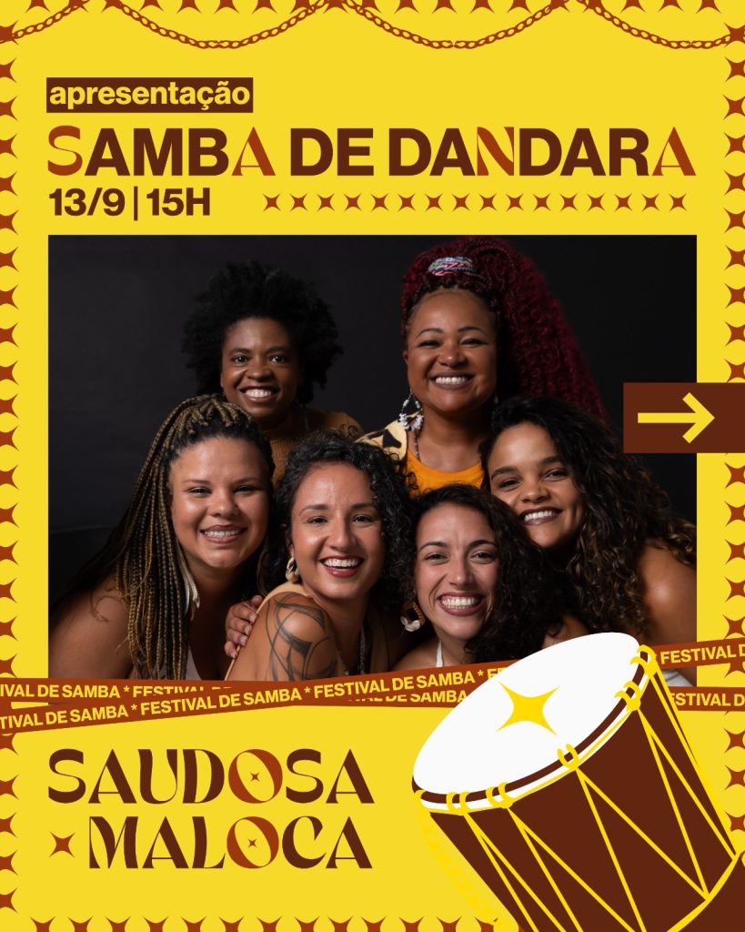 A força feminina do samba de São Paulo será celebrada nesta segunda edição do Saudosa Maloca! Em sua segunda edição, no dia 13 de setembro, o festival de samba que ocupa, mensalmente, a Vila Itororó, apresenta o Samba de Dandara, grupo 100% feminino que carrega a bandeira da exaltação às mulheres sambistas, trazendo as participações especiais de Luana Bayô e Jéssica Américo. Mais tarde, como destaques da apresentação da Roda Saudosa, duas matriarcas do samba paulista, Graça Braga e Bernadete, a Tulipa Negra do Samba, trazem todo o axé da Velha Guarda. A programação conta ainda com a presença da DJ Vivian Marques, apresentando ao público seu set de brasilidades. Esperamos vocês lá! Redes: @rodasaudosa @festivalsaudosamaloca