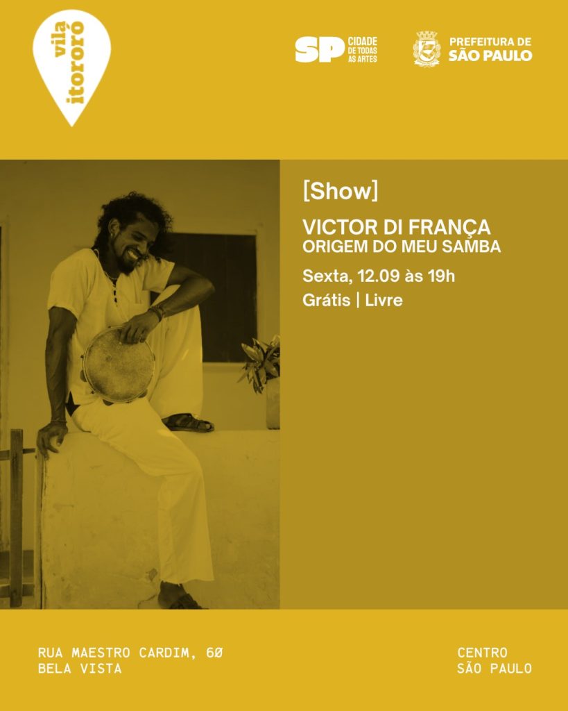 Victor Di França estreia seu show “Origem do Meu Samba” com repertório autoral, repleto de músicas dos gêneros do coco de roda, ciranda, samba, além de pontos de Jurema e Candomblé com seu grupo parceiro Os Ponta de Lança. De pandeiro na mão, com suas composições e suas ricas referências, vem conquistado o povo pelo timbre singular que carrega, trazendo à tona os conhecimentos do chão da tradição de seu território originário, tornando-se uma das novas vozes da cultura Pernambucana. Essa apresentação foi organizada pela produtora e jovem monitora Gabriela Malaquias como parte do seu projeto “De Nordeste a São Paulo: Ocupar a Cidade com Culturas da Tradição que a Formou”, resultado do PIAC (Plano de Intervenção Artístico Cultural) através do Programa Jovem Monitor Cultural.