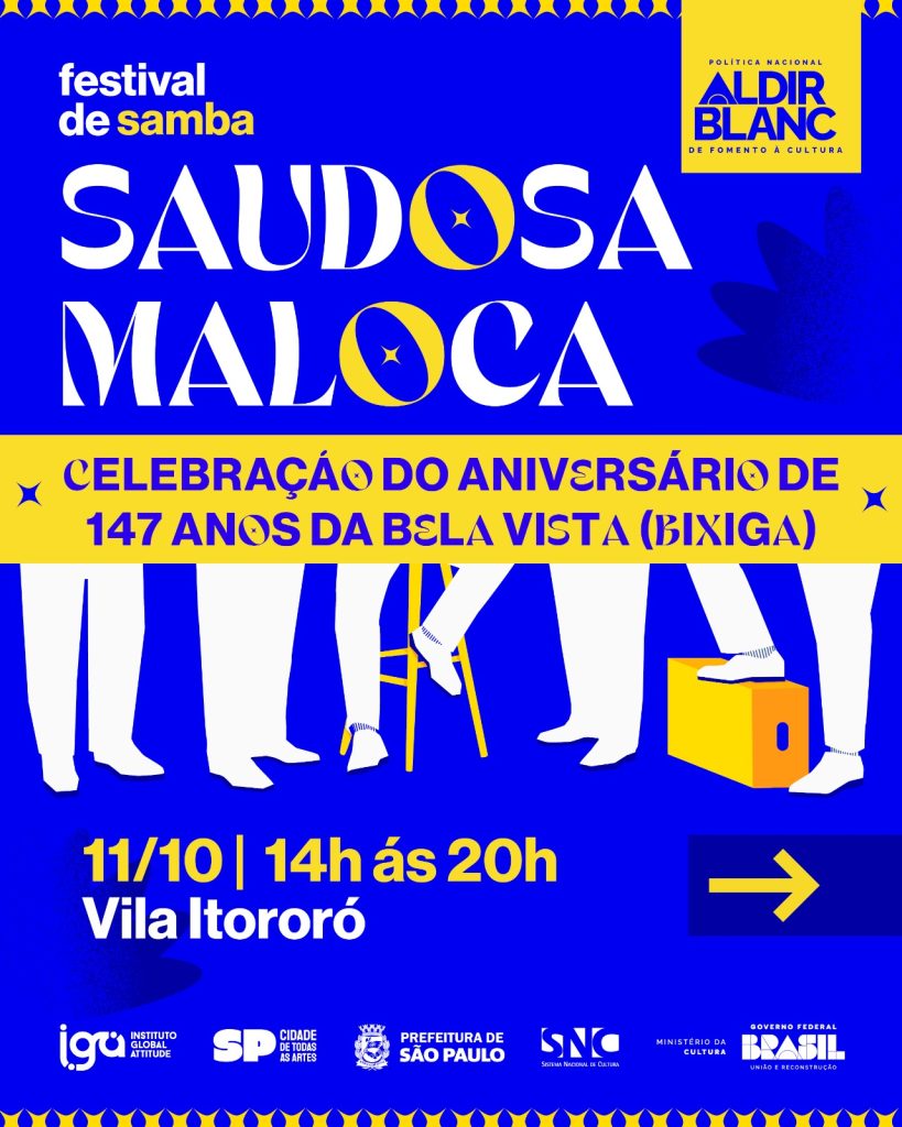 Comemorando o aniversário de 147 anos da Bela Vista, o Festival de Samba Saudosa Maloca apresenta em sua terceira edição, que será realizada no dia 11 de outubro, uma programação com participações especiais e muito representativas para o tradicional bairro da capital paulista. Nesta grande celebração ao Bixiga, o Galpão da Vila Itororó irá receber, além da “anfitriã” Roda Saudosa, os bambas locais da Velha Guarda Musical do Vai-Vai, o lendário conjunto Demônios da Garoa e a DJ Lia Macedo. O loteamento do local onde atualmente se localiza o bairro da Bela Vista teve início no dia 1º de outubro de 1878 pelas mãos do imperador D. Pedro II. À época, a região abrigava uma extensa área rural chamada de “Campos do Bexiga”, que pertenciam, até o ano de 1870, a Antônio José Leite Braga, que tinha este apelido por ter o rosto marcado pela varíola. Outro ponto histórico relevante do bairro foi o Quilombo da Saracura, situado na localidade onde, em 1930, surgiria o Cordão Carnavalesco e Esportivo Vae-Vae, o atual Grêmio Recreativo Cultural e Social Escola de Samba Vai-Vai. Ao longo dos tempos, a Bela Vista abrigou uma grande comunidade de imigrantes italianos, a maior parte deles vindos da região da Calábria, bem como de migrantes das regiões Norte e Nordeste. Atualmente, o bairro abriga o Centro de Referência e Atendimento para Imigrantes (CRAI) e tem atraído uma gama de imigrantes de países africanos, como Angola, Nigéria e República Democrática do Congo. Deste caldeirão cultural, o samba é, sem dúvidas, umas das expressões mais representativas e presentes no bairro, sendo a Escola de Samba Vai-Vai motivo de identificação e orgulho para os moradores e frequentadores do Bixiga. Dessa maneira, é simbólico que a Velha Guarda Musical do Vai-Vai se apresente nesta edição especial do Saudosa Maloca – a roda ainda contará com a presença de Aldo Bueno, cantor e compositor ligado ao bairro e que chegou até mesmo a morar na Vila Itororó. Também é carregado de simbolismo a apresentação dos Demônios da Garoa, lendário grupo de samba da capital paulista que popularizou inúmeros clássicos de Adoniran Barbosa, incluindo “Saudosa Maloca”, obra que dá nome este Festival de Samba que acontece mensalmente na Vila Itororó. Já a Roda Saudosa traz em sua formação neste mês, além da já tradicional seleção de sambistas de diversos cantos da cidade, a participação de Graça Braga, desta vez desde presente na roda de samba desde o início da apresentação, e de Osvaldinho da Cuíca, célebre representante da Velha Guarda do samba paulista e fortemente identificado com o Bixiga e com o Vai-Vai. Redes: @rodasaudosa @festivalsaudosamaloca